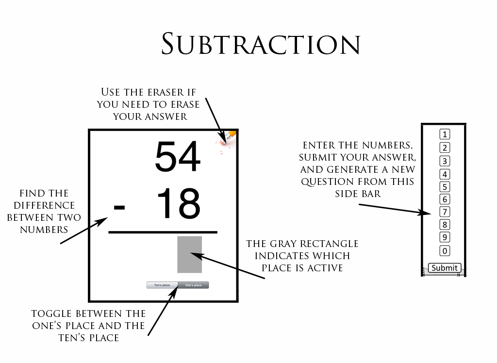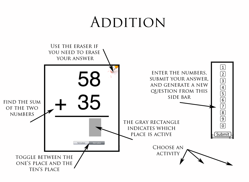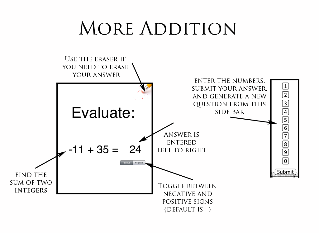 Gap App: Fractions was designed to identify and help correct weaknesses related to basic math computation. This app starts with basic addition and subtraction and works up to adding, subtracting, and comparing fractions. The user starts off at Level 1: Addition. These problems involve adding two positive integers together. In order to progress to the next level, the user must answer five questions in a row correctly.