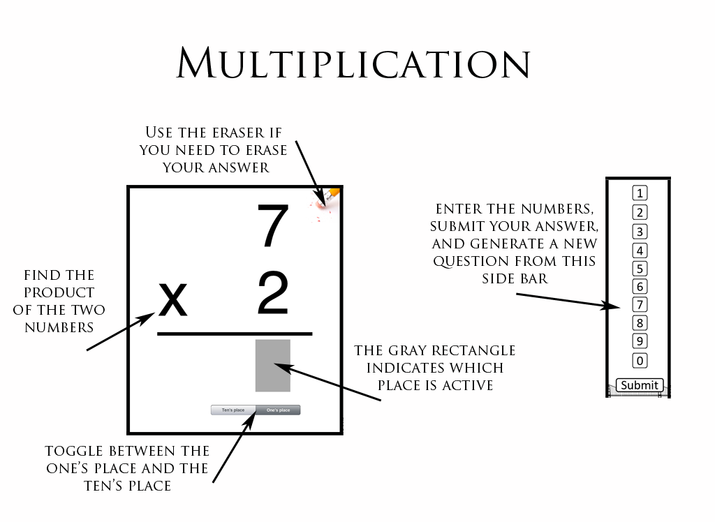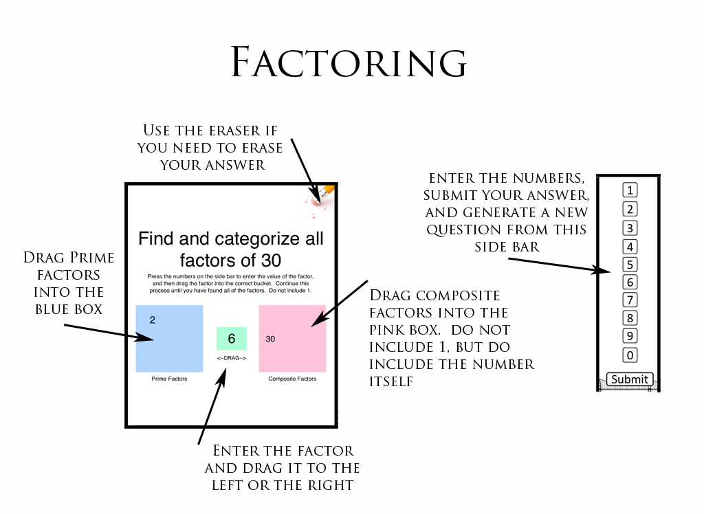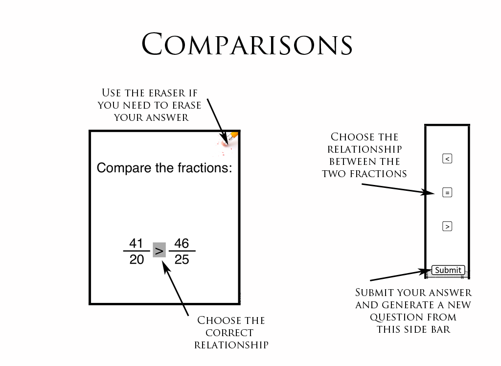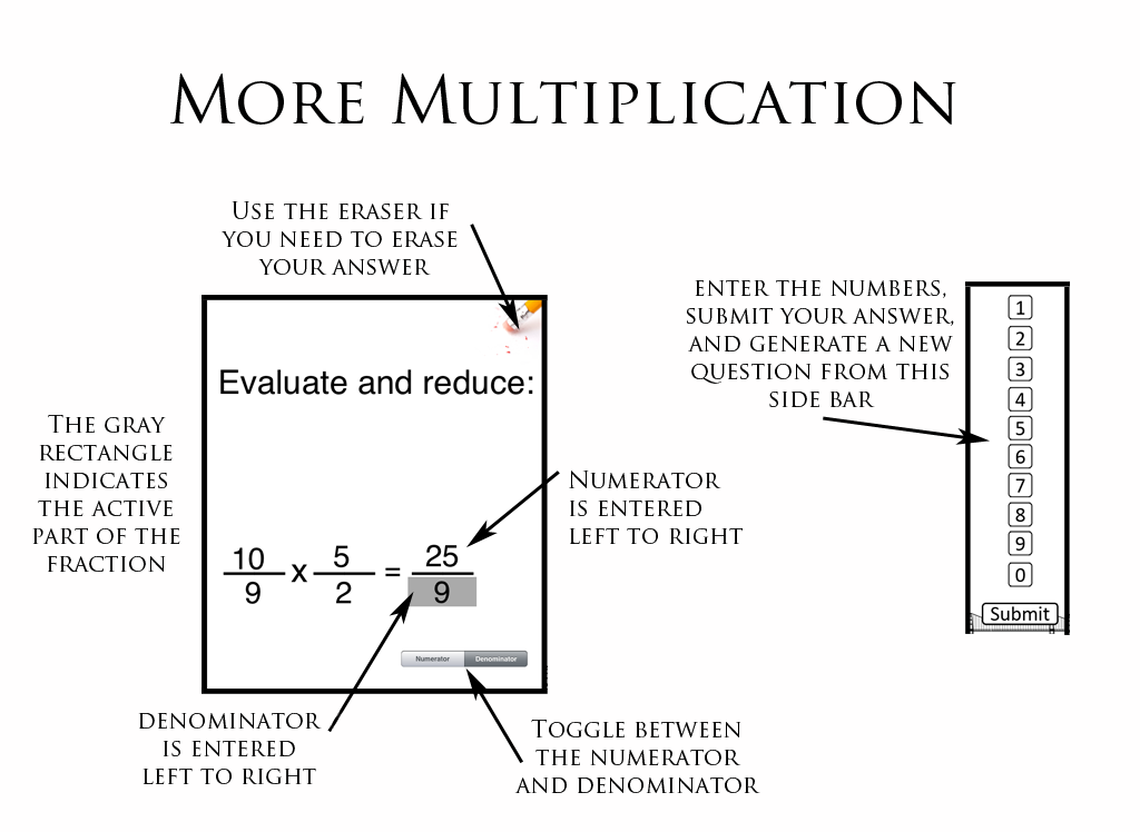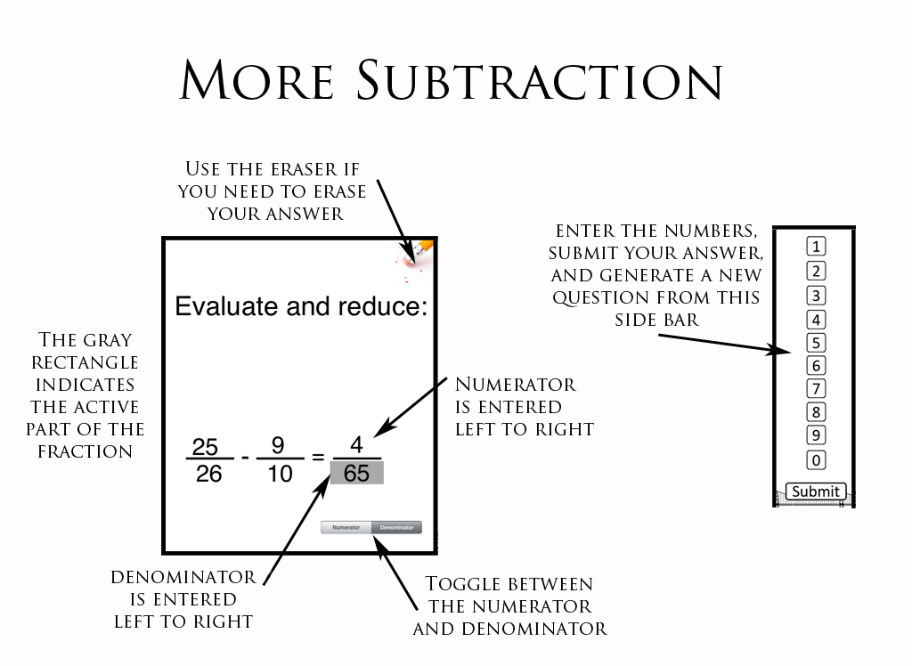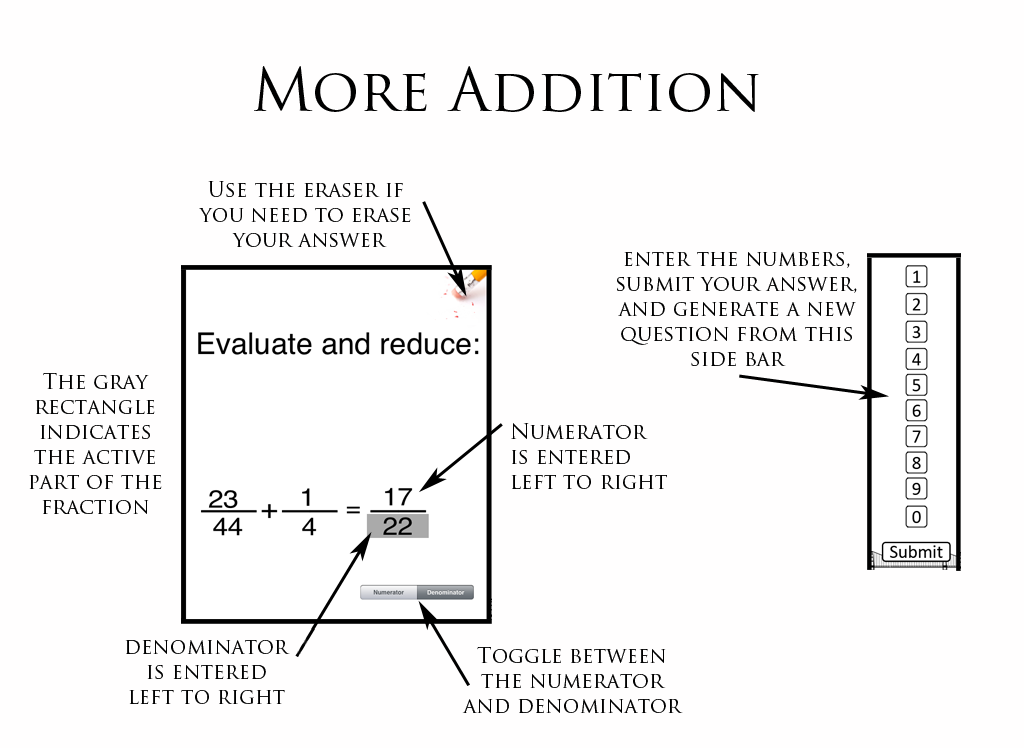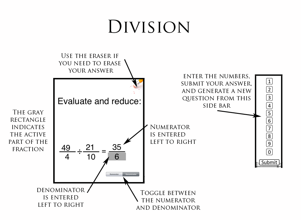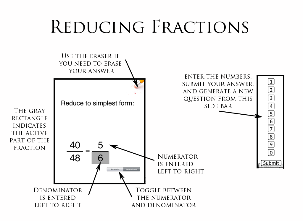 The primary objective is for the user to develop the computational skills necessary to work with fractions. It also enables the user to pinpoint where they need more practice, or need further instruction. This app would primarily be used to assess the user's knowledge gap. This material is typically covered prior to middle school, so it could be used to help teachers identify gaps, and help them target assignments based on where the student is having problems (rather than just determining that a student has not mastered adding fractions, the teacher can identify where the student is having problems, and target their instruction more effectively).