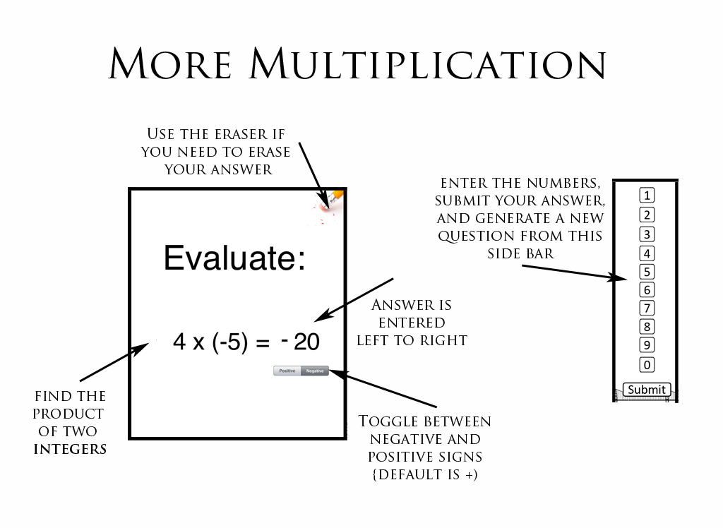 - Multiplication (basic times tables...positive integers)