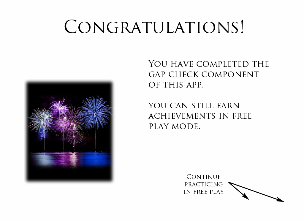 The "Gap Check" mode keeps track of the time, the number of problems answered and the number of problems answered correctly when completing the level. This enables the user to see which types of problems they need to practice. If a user completes a level by answering the first 5 questions correctly, they may not need to spend much time reviewing the topic. But if the user gets a few problems incorrect, they know that they need to practice that skill (in "Free Play" mode). In "Gap Check" mode, the user is walked through the levels, in order. A user cannot skip around. They work on a level, complete it, and move on to the next level.